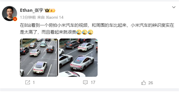 博主曬小米汽車俯拍圖:辨識(shí)度太高了 看起來就很貴